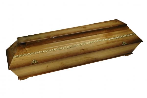Klasická celodřevěná rakev české výroby, mořená ve světlých tónech s patinou na hranách. Doplněna o zlaté zdobení po celém obvodu, s patinovanými zámky. Vhodná pro kremaci a uložení do hrobu.