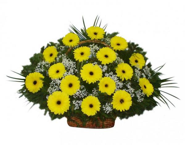 Proutěný košík z gerber doplněn přízdobou, s možností barevných variant. Je vhodnou a vkusnou volbou pro dekoraci před rakev nebo přímo na hrob. Je praktický a snadno přenosný.