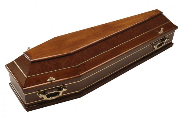 Klasická celodřevěná rakev české výroby, mořená v barvě tmavého ořechu s kresbou kořenového dřeva. Doplněna o zdobení po celém obvodu, se zlatými madly a zámky. Vhodná pro kremaci a uložení do hrobu.