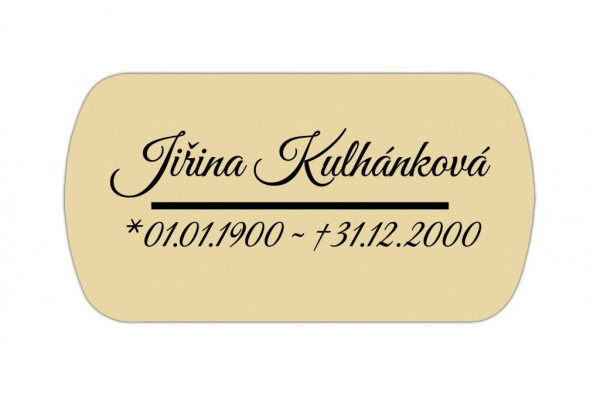 Velký kovový štítek na urnu, nebo rakev, stříbrné, nebo zlaté provedení, UV rezistentní.