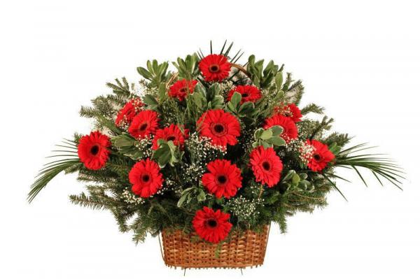Proutěný košík z gerber doplněn přízdobou, s možností barevných variant. Je vhodnou a vkusnou volbou pro dekoraci před rakev nebo přímo na hrob. Je praktický a snadno přenosný.