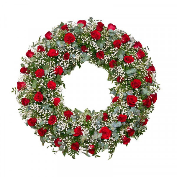 Luxusní smuteční věnec z živých růží, doplněný o listy eukalyptu. Růže přinášejí možnost volit z mnoha barevných variant.