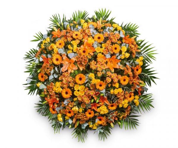 Krásný honosný věnec plný živých květů v pestrých odstínech nebo umírněnějších jemných tónech zvolených dle Vašeho přání.