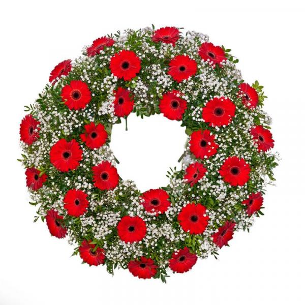 Luxusní smuteční věnec z živých gerber. Barevnost lze změnit dle aktuální nabídky, včetně mixu barev.